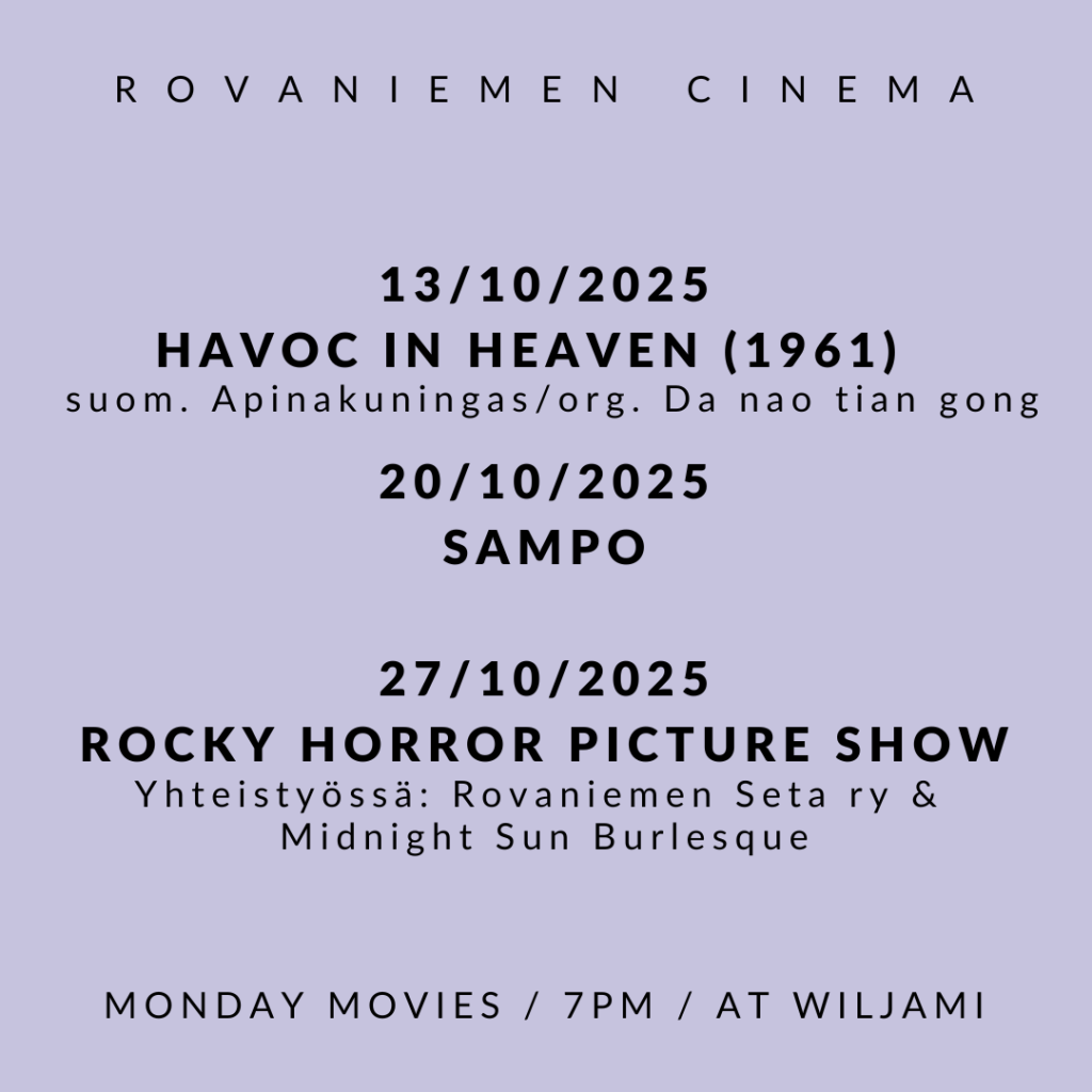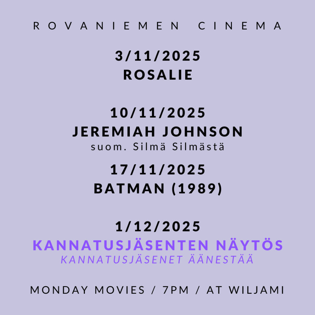 Rovaniemi Cinema starttaa viikon elokuvahelmillä. Hanki jäsenyys (10 € koko kausi, 20€ kannatusjäsenyys), pakkaa leffaeväät ja suuntaa Wiljamille. Emme myy lippuja maanantainäytöksiin. Kaikkiin näytöksiin pääset jäsenkortilla. Voit ostaa jäsenkortin ovelta ennen elokuvaa (10€/20€ – kortti ja käteinen). Kaikukortilla pääset maksutta elokuviin, vaikka talous olisi tiukalla.